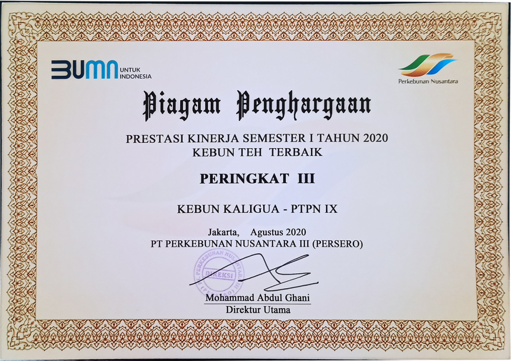 Peringkat III Prestasi Kinerja Semester 1 Tahun 2020 Kebun Teh Terbaik dari PT Perkebunan Nusantara III (Persero)