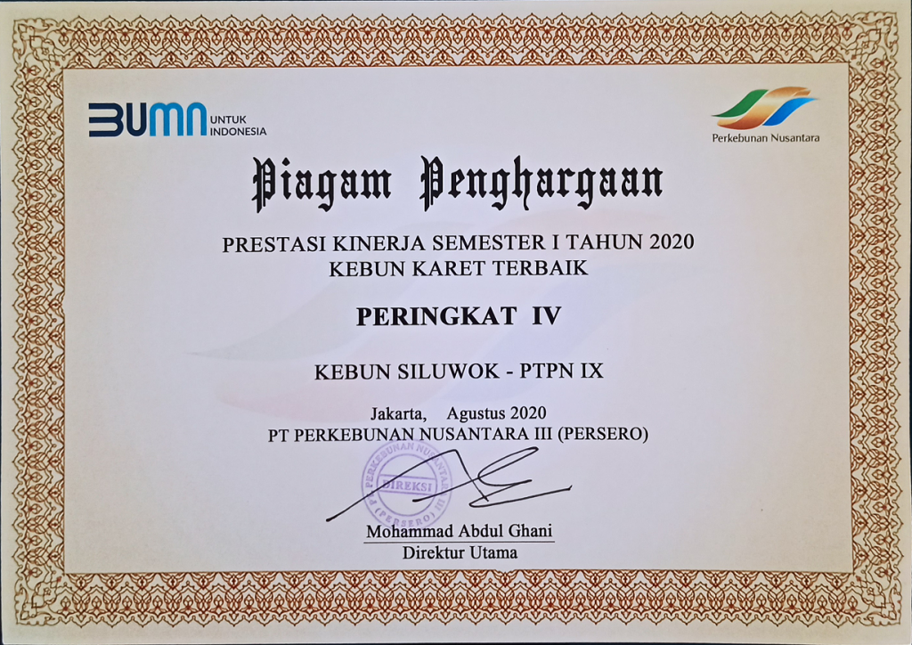 Peringkat IV Prestasi Kinerja Semester 1 Tahun 2020 Kebun Karet Terbaik k dari PT Perkebunan Nusantara III (Persero)